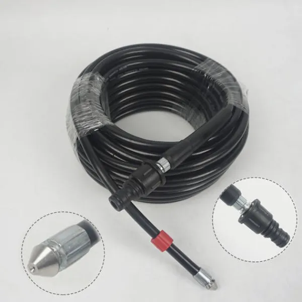 Rörrengöringsmunstycket i rostfritt stål är utrustat med ett främre högtrycksrengöringsmunstycke och tre bakre drivmunstycken så att röret kan trycka röret och automatiskt avlägsna smutsen. Det maximalt tillåtna arbetstrycket är 155 bar, även envis smuts kan avlägsnas omedelbart!