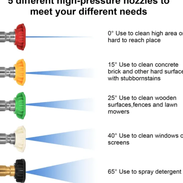 Komplett kit: Du får 1 st rengöringsadapter, 5 st mässingsmunstycken med 5 färger: röd, gul, grön, vit och svart, de med olika vinklar (0, 15, 25, 40, 65 grader). Du kan välja olika munstycken efter faktiska behov, vilket är bekvämt och effektivt.