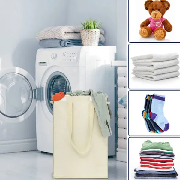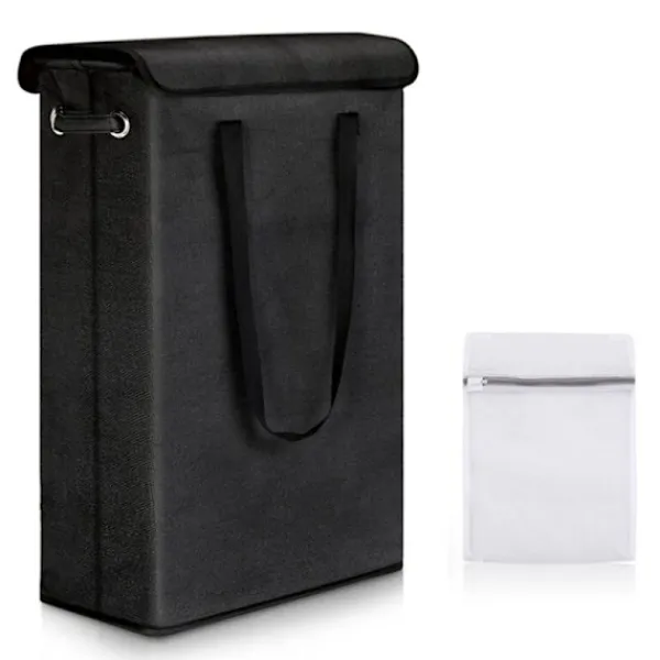 Tvättpåse. En tvättpåse ingår för att skydda kläder vid tvätt, förvaring av underkläder, behåar, strumpor etc. Tvättkorgen har 4 hopfällbara stänger och en hård bottenbas med gummifötter, den kan stå upprätt även om den är full av kläder, handdukar och andra saker. Den höga och smala designen hjälper dig att förbättra hörnutnyttjandegraden. Den fina tvättkorgen kan hjälpa dig att spara mycket utrymme efter avslutad tvätt.