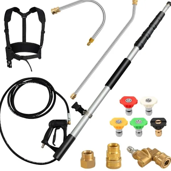 Denna förbättrade teleskopiska högtryckstvätt inkluderar två adaptrar (M22-14 mm och M22-15 mm) och en vridbar koppling för att möta dagliga behov. Den rekommenderas för användning med gasdrivna eller elektriska högtryckstvättar med ett tryck på 281 kgf/cm². Snabbkopplingsdesignen av olika kopplingar gör monteringen enkel, och änden på spraystaven är utrustad med en säkerhetsavtryckare för enkelt grepp och manövrering. Detta tillbehör för högtryckstvätt är perfekt för rengöring av hängrännor, väggar, uppfarter, staket och till och med fordon.