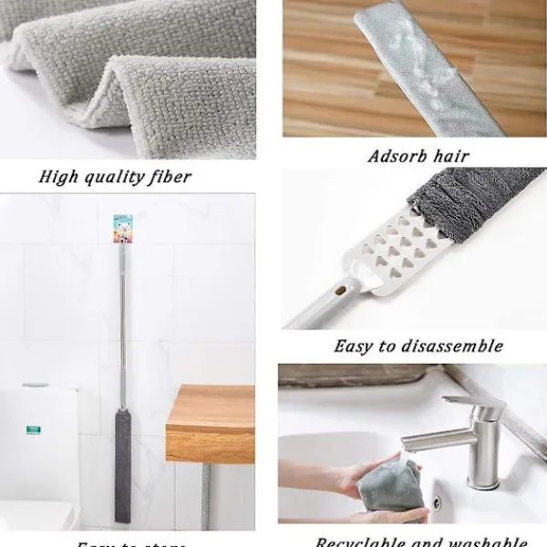 Produktbeskrivning 1. Rengöringsborste för springor Dammvippan för under apparater är extremt tålig, kan böjas fritt, har stark rengöringskraft, flexibilitet och planhet, den kan nå in i hörn, springor och platser som är svåra att rengöra eller inte kan rengöras normalt. 2. Utdragbar dammuppsamlare Förlängningsstången kan nå upp till 101 cm och kan rengöra var du vill i ditt hem utan att behöva klättra på en stege eller knäböja för att rengöra. 3. Högkvalitativa material Mikrofiberdamvippan hålls av PP-material och aluminium. Texturen är mjuk och skadar inte ytan, statisk elektricitet absorberar damm och hår, och rengöringsförmågan är extremt stark. Inget håravfall och kan användas i många år