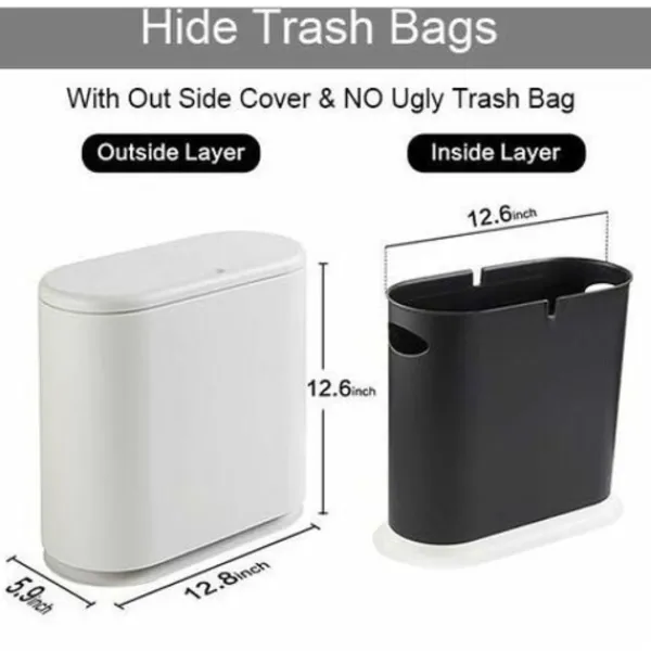 ? € ?€’ Med ett vitt yttre hölje kan det dölja sopsäckarna så att du inte kan se sopsäcken hänga på sidorna av soptunnan, hålla ditt hus rent. Mått: 12,79′ L x 5,74′ DX 12,44’H. Rymmer upp till 10 liter / 2,4 gallon avfall. Den moderna formen i kombination med klassiska färger och släta linjer kommer att förhöja din visuella njutning, perfekt för kontor, badrum, sovrum, vardagsrum, sovsal, etc.