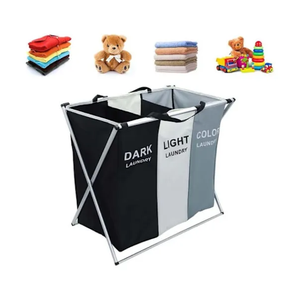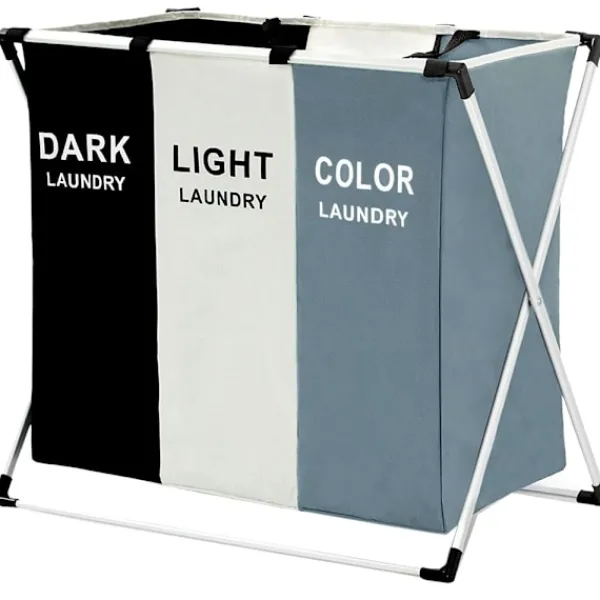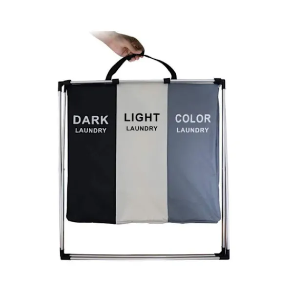 Denna praktiska tvättkorg med tre fack gör sorteringen av kläder enklare och mer effektiv. Genom att separera olika typer av tvätt sparar du tid och håller ordning i tvättstugan. Den moderna designen gör att korgen smidigt passar in i alla hem och ger ett stilrent intryck. Ramen är tillverkad av hållbart aluminium, vilket gör den både lätt och stadig. När korgen inte används kan den enkelt vikas ihop för förvaring i garderoben, vilket sparar plats.