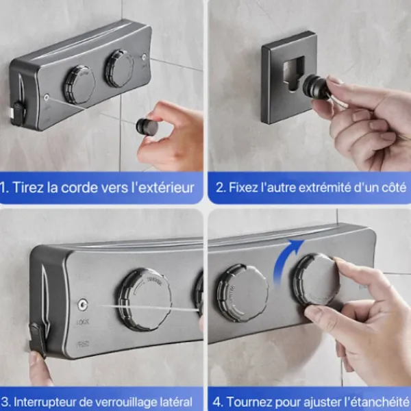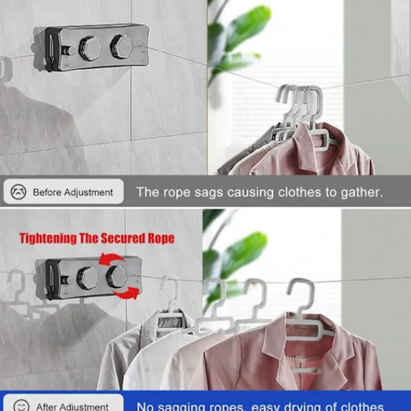 Lätt att Använda – Den utdragbara väggmonterade tvättlinan fästs enkelt på väggen, dras ut till önskad längd och fästs i andra änden med hjälp av den medföljande skruvhaken. Den manuella inrullningsratten gör att du kan justera tvättlinan så att den är spänd, vilket förhindrar att den sjunker.