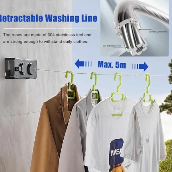 Platsbesparande – Den dubbla utdragbara tvättlinan erbjuder en maximal torklängd på 5 meter. Den utdragbara tvättlinan är perfekt för inomhus- och utomhusbruk i ett litet utrymme. Spara plats i huset!