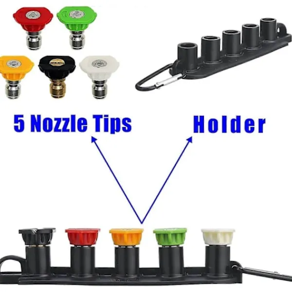 5 spraymunstycken har olika sprayvinklar (0.15, 25, 40, 65 grader). Välj olika munstycken efter dina behov. För att vattna blommor och växter, tvätta bilar, tvätta staket och rengöra trottoarer.