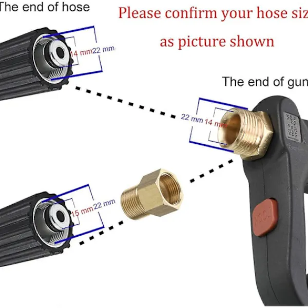 Observera: Ej lämplig för trädgårdsslang, trädgårdsslang eller kran direkt. Om högtryckstvättslangen har en 14mm innerdiameter M22 anslutning, anslut direkt till slangen. Om slangen har en 15mm ID M22 anslutning, anslut mässingskopplingen mellan pistolen och slangen.