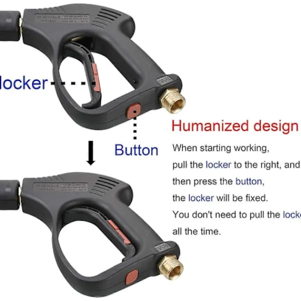 Varning: Ej lämplig för trädgårdsslang, till trädgårdsslangen eller kranen direkt. Rengöringspistolen är designad för varmt och kallt vatten. Den maximala vattentemperaturen är 160C. Arbetstryck upp till 5000 psi. Flödeshastigheten är klassad till 8 GPM. Bekvämt handtag för enkel användning. Triggerlåset kan förhindra misstag.