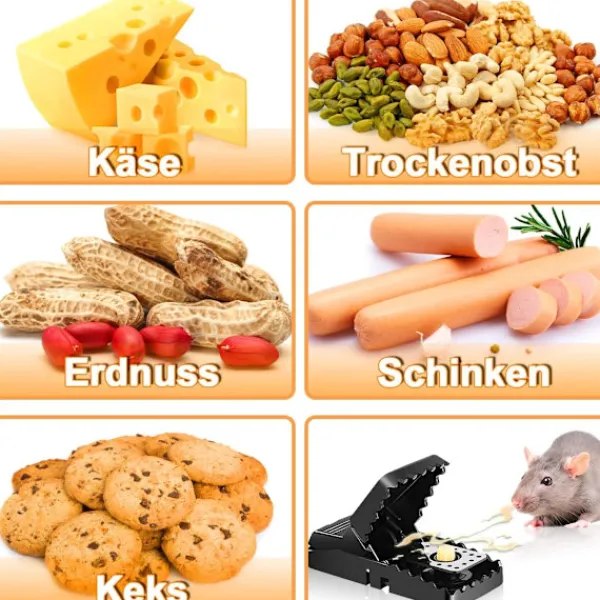 Lätt att använda: Ta först bort betesskålen från baksidan, tillsätt sedan helt enkelt ost, leverpastej, bacon, nougatkräm, jordnötssmör etc. Tryck ner, justera skålen bakåt och spänn fällan. Klart! Lämplig för uteplatser, hus, vindar och källare.
