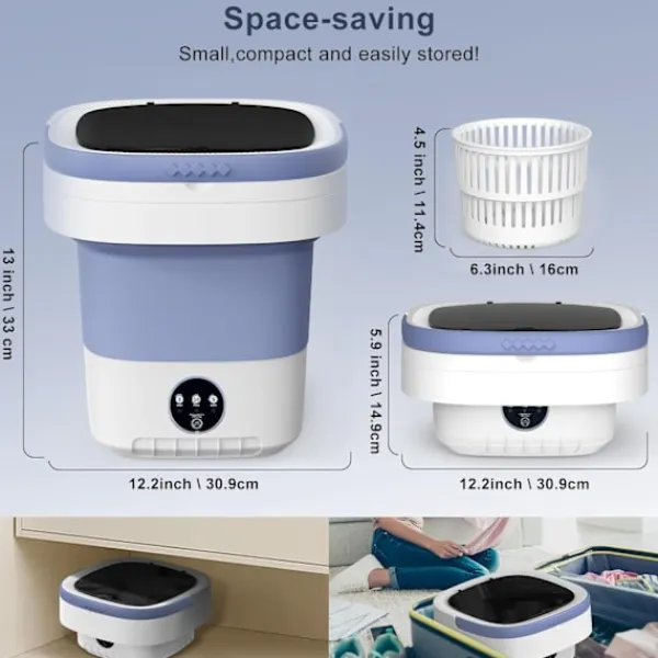 【Utrymmesbesparande Vikbar Design】Den smarta vikbara designen på vår lilla mini-tvättmaskin gör att den bara mäter 30 x 24 x 24 cm när den är hopfälld. Den kan enkelt förvaras mellan hyllor eller under sängen och tar minimalt med plats i ditt hem. Säg adjö till skrymmande tvättmaskiner som tar upp värdefullt utrymme.