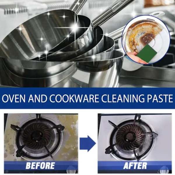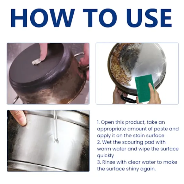 Våra rengöringspastor för rostfritt stål innehåller ytaktiva ämnen, metallintegratorer och penetranter. Den kan snabbt och effektivt ta bort envisa fläckar på olika ytor av rostfritt stål, sanera och förhindra rost samt ge kraftfull rengöring. Användningsmetoden är mycket enkel: 1. Öppna produkten och ta lämplig mängd pasta på ytan av fläcken 2. Fukta rengöringsdynan med varmt vatten och torka sedan snabbt av ytan 3. Skölj med rent vatten för att få ytan att glänsa igen. Rengöringspasta för rostfritt stål tar snabbt bort alla typer av envisa fläckar, oxidationslager och rostfläckar på ytor av rostfritt stål, vilket förlänger livslängden på metallköksredskap. Lämplig för rengöring av ugnar, grytor, kokkärl, spisar, dörrar och fönster, bilar, keramisk sanitetsartiklar, glas och så vidare. Enkel och snabb att använda, bara att torka och skölja för att få en spegelliknande glänsande effekt på köksredskap.