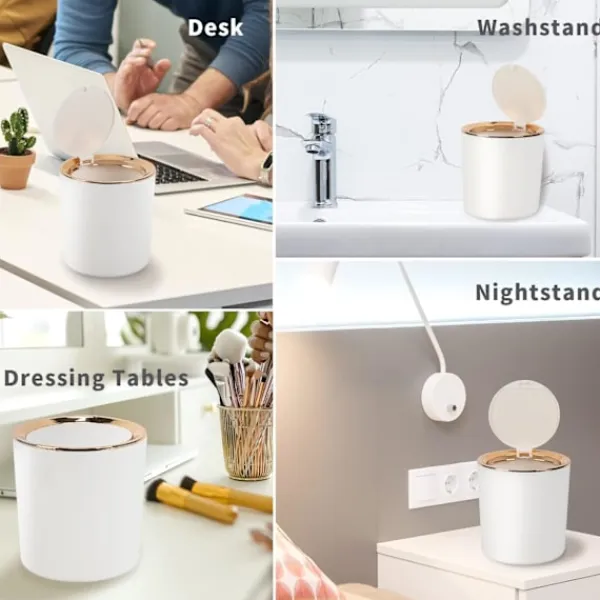 Bekvämlighet: Mini papperskorg för bord för barn, rund utan skarpa hörn, lätt att flytta, vänligt utseende, behaglig känsla, lätt att slänga avfall, kan också vara mycket elegant och repar inte dina händer. Minikorgen med lock är lämplig för kök, kontor, vardagsrum och sovrum.
