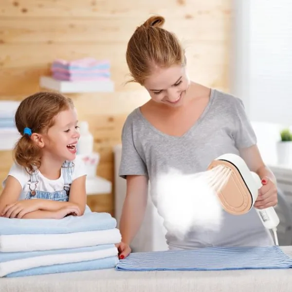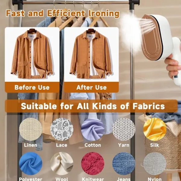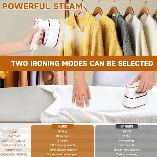 Upplev professionell klädvård på resande fot med denna 2-i-1 bärbara ångare och strykjärn, med 1000W snabb uppvärmning och dubbla stryklägen för enkel rynkborttagning.