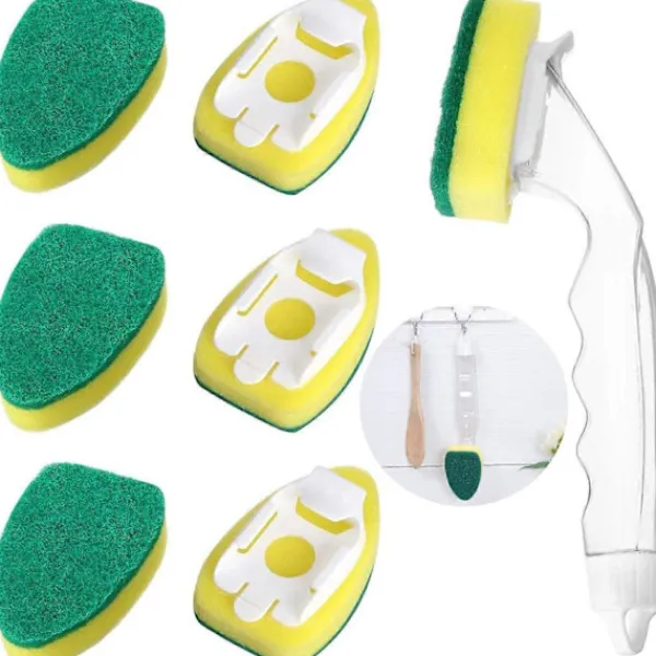 AVTAGBART HANDTAG Handtaget är utformat efter formen på den mänskliga handen, så det kan greppas bekvämare. Och det är i form av en flaska, som kan fyllas med diskmedel. Dessutom kan det avtagbara handtaget enkelt installeras och rengöras. När du behöver byta svamphuvud behöver du bara försiktigt trycka av det och sedan låsa svampen ordentligt, så att handtaget inte lätt faller av.