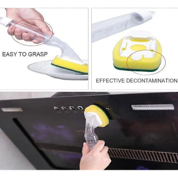 AUTOMATISK VÄTSKA Du kan hälla rengöringsvätskan i handtaget i förväg, och du behöver inte hälla rengöringsvätskan igen under rengöringsprocessen. Sedan kommer den att flöda ut genom svampen för att rengöra din disk. Det sparar ditt diskmedel och tiden för att skumma själv. Dessutom bör du notera att du måste kontrollera mängden rengöringsvätska som hälls i handtaget när du diskar för att undvika slöseri.