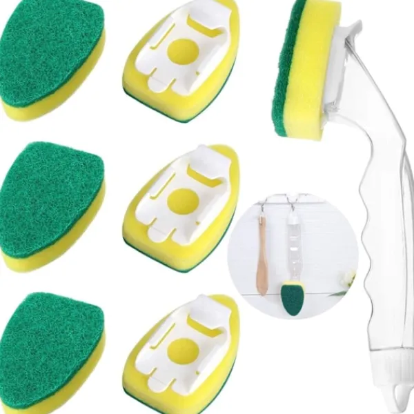 【AUTOMATISK VÄTSKA】 Du kan hälla rengöringsvätskan i handtaget i förväg, och du behöver inte hälla rengöringsvätskan igen under rengöringsprocessen. Sedan kommer den att rinna ut genom svampen för att rengöra dina diskar. Det sparar ditt rengöringsmedel och tiden för att skumma själv. Dessutom bör du notera att du behöver kontrollera mängden rengöringsvätska som hälls i handtaget när du diskar för att undvika slöseri.