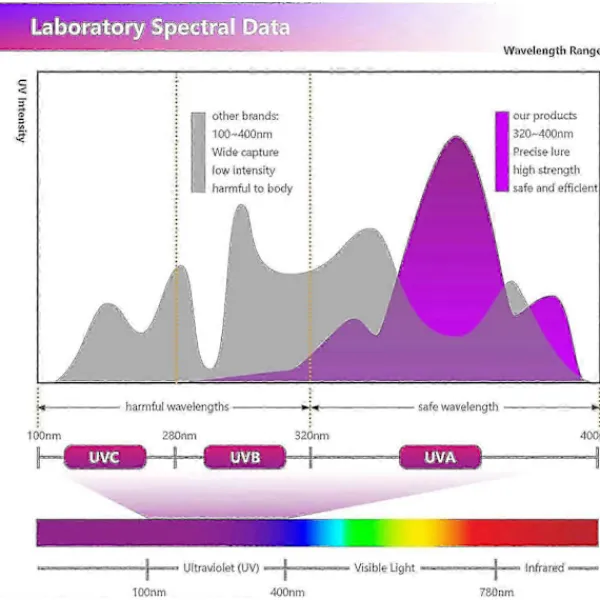 FunktionDen huvudsakliga våglängden är 365 Nm – Används för att locka till sig små skadedjur som husflugor, myggor, malar etc., med god fångsteffekt och energibesparing.