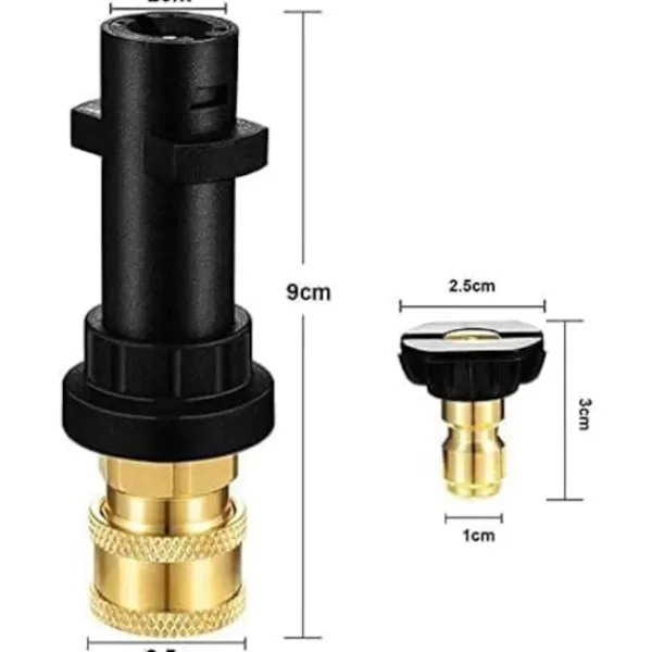 ENKEL ANSLUTNING: Ena änden av högtryckstvätt pistol adaptern som är kompatibel med Karcher, ansluts till munstycke eller skumkanon utrustad med 1/4″ anslutningsport. Och den andra änden sätts in i pistolen och rotera kontakten medurs.