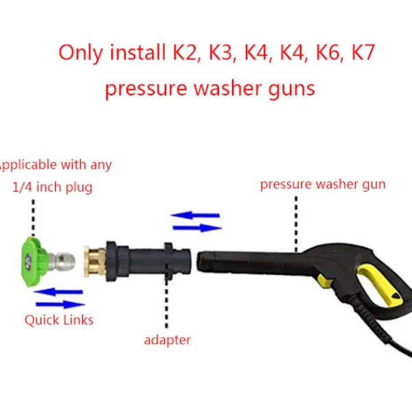 Användningsmetod: Konvertera till 1/4 tum (ungefär 0,6 cm) snabbkopplingshylsor. Anslut pistolen till munstycksspetsen på den elektriska tvättmaskinen eller en skumpistol med en 1/4 tum (ungefär 0,6 cm) kontakt i ena änden. Sätt in den andra änden i pistolen och vrid adaptern medurs.