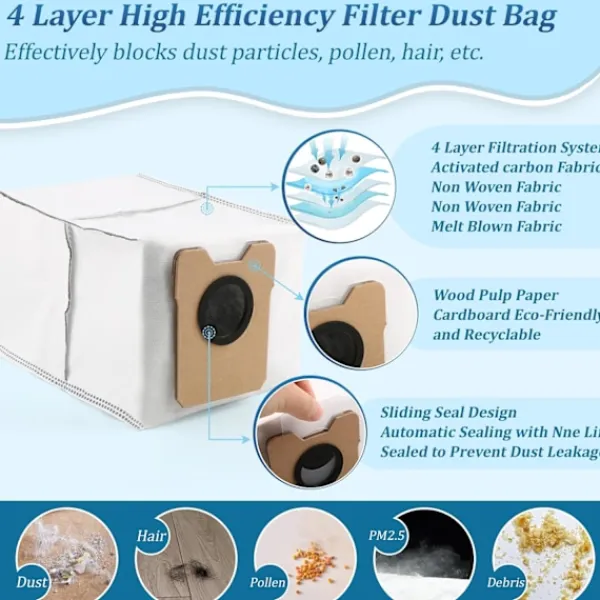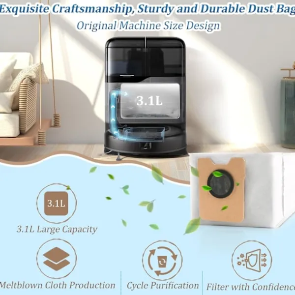 Stor kapacitet: Med en generös kapacitet på 3,1 liter minimerar dessa dammpåsar frekvensen av byten. Detta är särskilt praktiskt för större hem eller hushåll med betydande damm- och skräpaccumulation. Den utökade kapaciteten möjliggör längre rengöringssessioner utan avbrott, vilket sparar tid och ansträngning. Njut av bekvämligheten med mindre frekventa påsbyten och en effektivare rengöringsrutin, vilket säkerställer att din Eufy Omni C20 robotdammsugare alltid är redo att ta itu med alla typer av smuts.