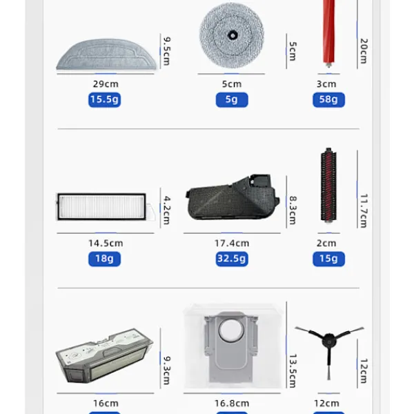 Förbättrad rengöringseffektivitet: Paketet innehåller reservdelar såsom huvudborstar, sidoborstar och filter, utformade för att bibehålla rengöringseffektiviteten hos din Roborock-dammsugare. Regelbundet byte motverkar slitage och ser till att din robot fortsätter att städa med optimal effektivitet.