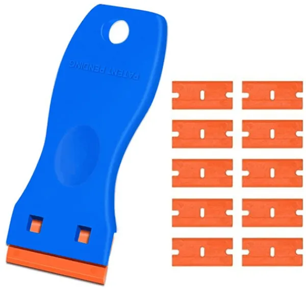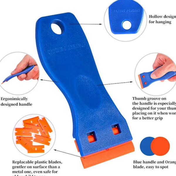 Repfria skrapor: Plastskrapan är tillverkad av kolfiberplast, robust och hållbar, inte lätt att bryta. Speciell plastdesign som gör att klistermärkena kan tas bort utan att repa dem och skyddar dig även från oavsiktliga skärsår