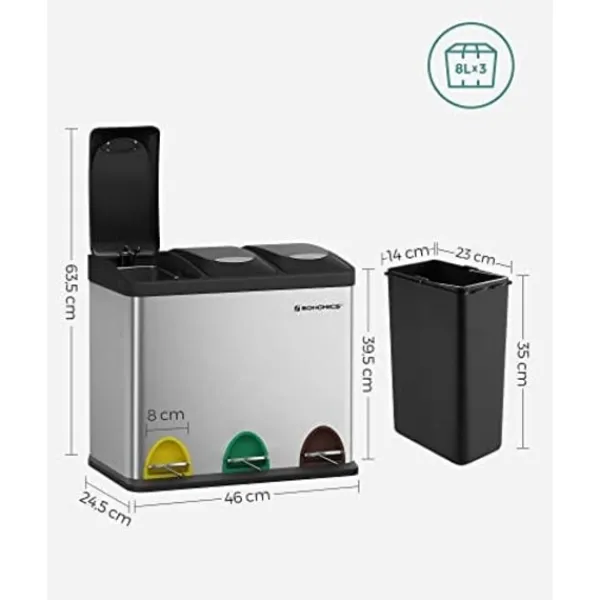 Vad du får: en 24L skräpfack med 3 sektioner, olika färgade pedaler och avtagbara inre hinkar för enkel avfallshantering och problemfri återvinning