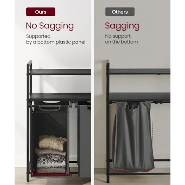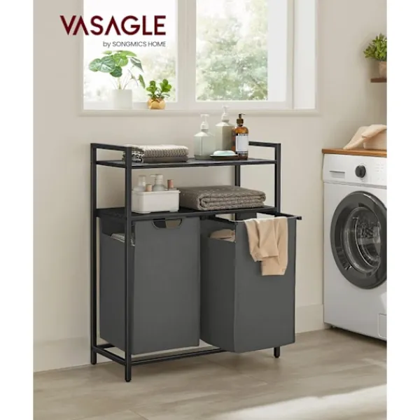 Mångsidig användning: Perfekt för att hantera allt från smutsiga kläder till förvaring av vikta kläder och andra hushållsartiklar. Dess två hyllor ger extra utrymme för att hålla dina nödvändiga redskap nära till hands.