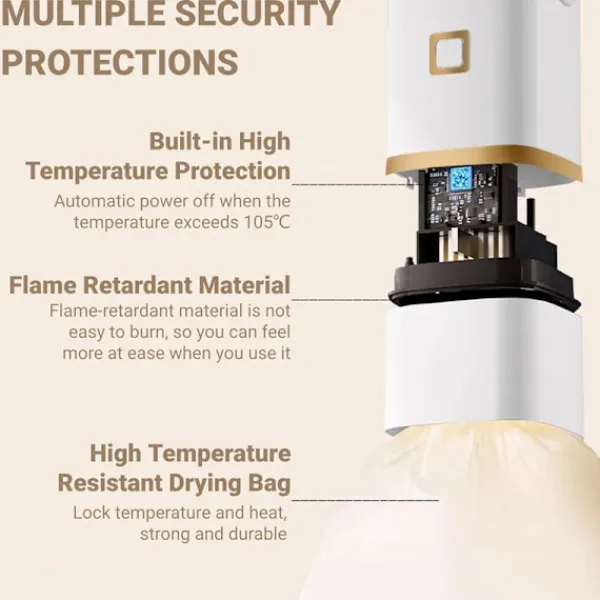 Inbyggt överhettningsskydd – autoavstängning vid 105°C. Flammebeständig utblås och torkpåse för säkerhet.
