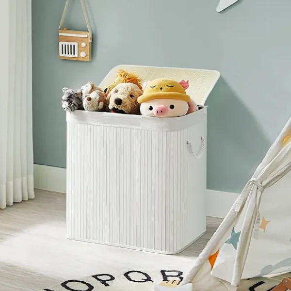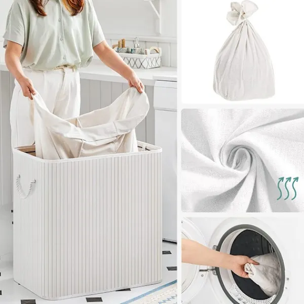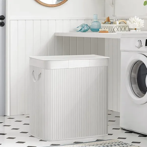 Denna praktiska tvättkorgen gör det enkelt att hålla ordning på smutstvätten. Med tre separata fack kan ljusa, mörka och färgade kläder sorteras direkt, vilket sparar tid vid tvättning. Det stabila bambulocket döljer tvätten och förhindrar att lukt sprids, samtidigt som det ger ett stilrent intryck.