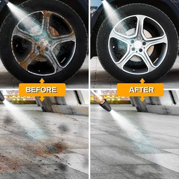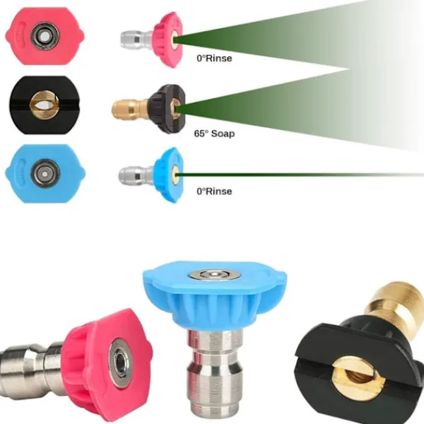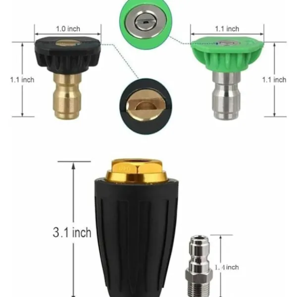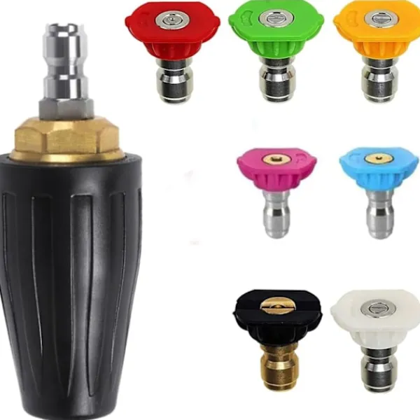 Anti-rost och rostfritt material: Högtryckstvättens turbo munstycke är tillverkat av slitstark keramik och gummi exteriör samt mässing. Vortex munstycket är tillverkat av aluminiumlegering och en 1/4 tums snabbkopplingskontakt. Turbo rengöraren är designad för varmt och kallt vatten i rengöraren. Den maximala temperaturen är 100 °C. Det maximala trycket kan nå upp till 4000. Det roterande högtryckstvättsmunstycket har en 1/4 tums snabbkoppling för att göra rengöringen mer effektiv. Passar de flesta märken av högtryckstvättar eller pistoler. Det roterande högtryckstvättsmunstycket skapar en kraftfull roterande stråle, ökar både intensiteten och rengöringsytan på munstycket. Spraymunstycket rengör upp till 40% snabbare än standardmunstycken. Idealisk för rengöring av smutsigt tegel, betong, vinyl och andra stora mängder smutsiga eller kraftigt nedsmutsade områden. Komplett kit: 7 rengöringsmunstycken med olika sprutmönster. (röd 0°, gul 15°, grön 25°, vit 40°, svart 65°, rosa tvål läge, blått skölj läge) ger en spray som når bortom standarden för spraymunstycken.