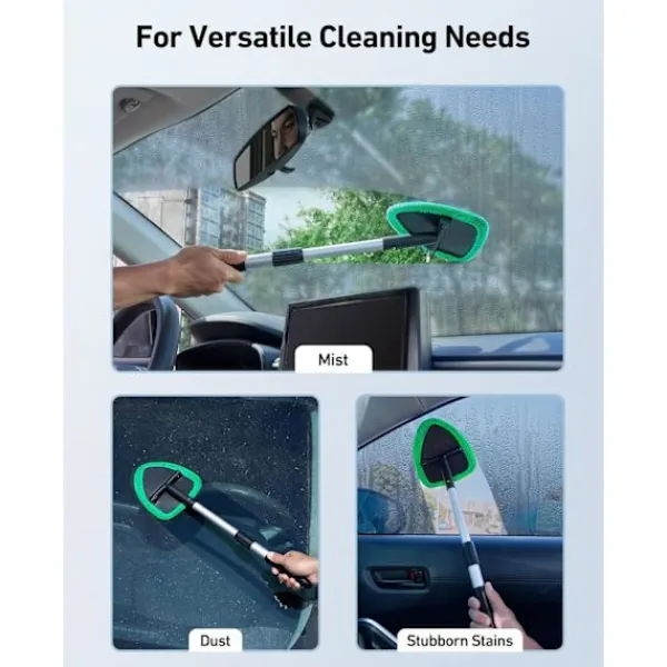 Specialist på invändigt glas: Den invändiga bilfönstertvätten har ett 180-graders roterande huvud för att komma åt svåråtkomliga områden bakom instrumentbrädor. Vindrutetvättverktyget kan förlängas från 40,4 cm till 53,3 cm. Du behöver inte längre skada ryggen när du rengör