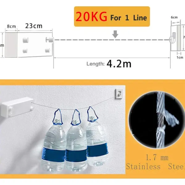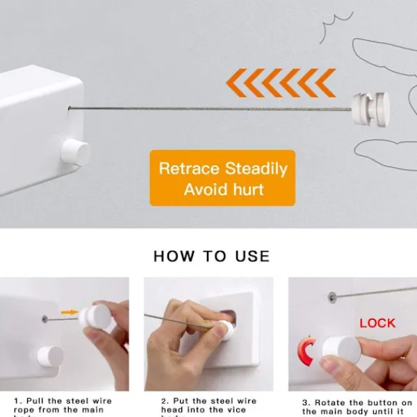 Robust – Tillverkad av premium ABS-material, med en aluminiumfäste, är denna tvättlina värmebeständig, vilket garanterar dig utmärkt kvalitet och livslängd.