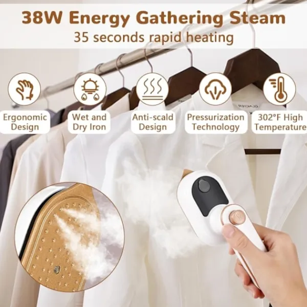 Vattentanken är dold och integrerad i strykjärnet. Före användning, öppna helt enkelt vattentankens lock och fyll vattentanken med en flaska vatten för att undvika stänk. Fukta plagget med en spray och börja stryka. Vi erbjuder även värmedynor. Efter användning kan du placera strykjärnet på värmedynan. 2-i-1 Design: Handhållen klädångare med 2-i-1 design för våt- och torrstrykning. Strykning inom 30 sekunder efter att maskinen slagits på för torrstrykning. Efter påslagning, tryck på vattensprayknappen för att spraya vatten, börja sedan våtstrykning.