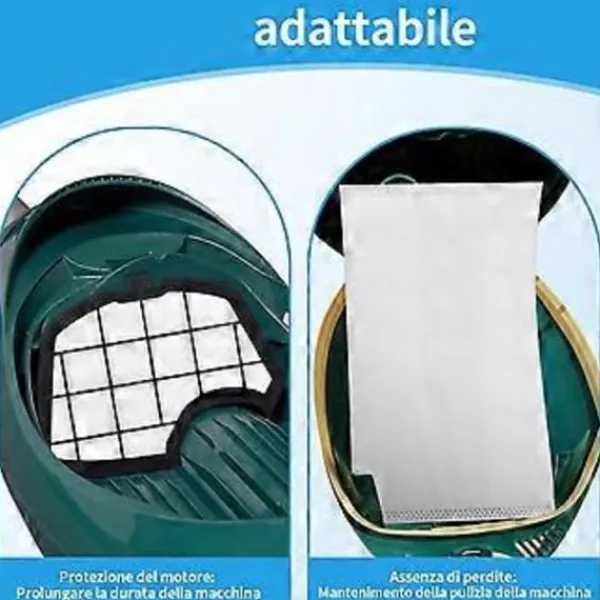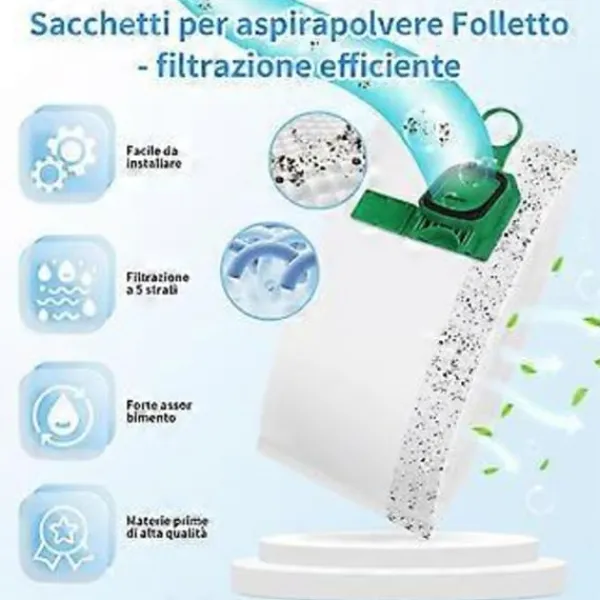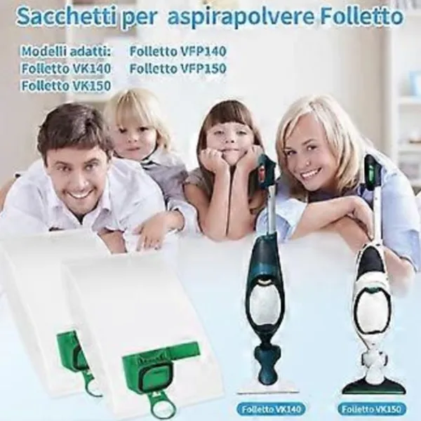 Automatiskt förslutningssystem: Det innovativa automatiska påsförslutningssystemet för Folletto VK140 dammsugarpåsar säkerställer att allt damm och smuts som samlats in är säkert inneslutet i påsen, vilket förhindrar potentiell kontakt med skräpet under bortskaffandet.