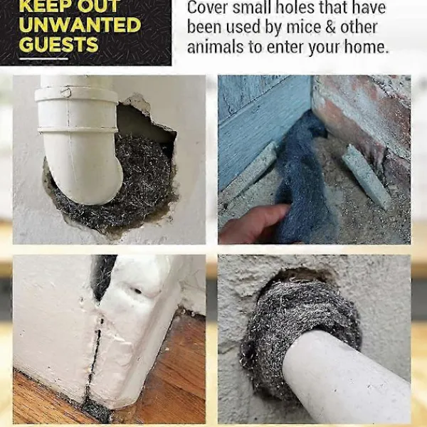 Bred användning – Fin stålull skyddar effektivt mot att möss eller smådjur tränger in genom smala utrymmen, och den kan användas för att fylla inomhus och utomhus, till exempel hus, garage, kontor, kök, vind, radiatorrör, utrymme runt rör, olika dräneringshål.