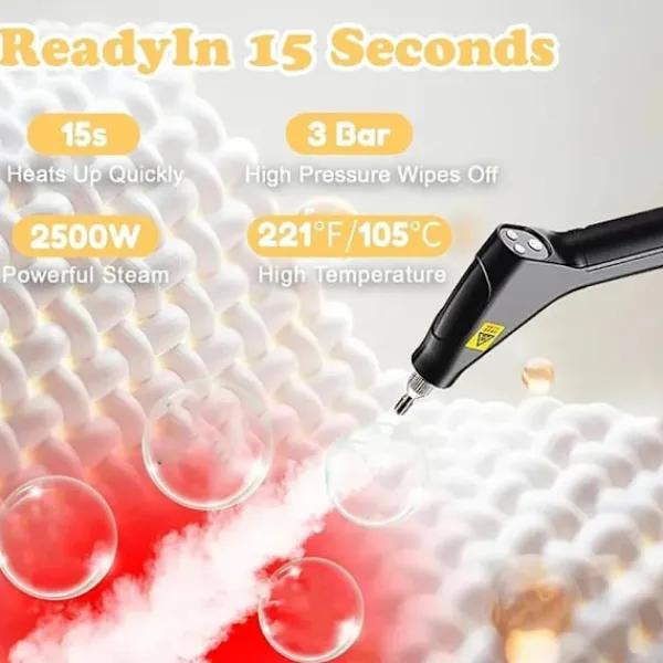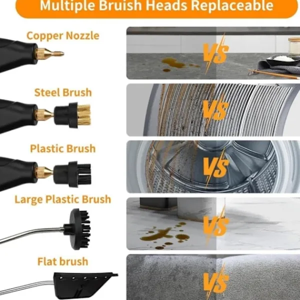 Omedelbar ångrengöring: På bara 15 sekunder omvandlas vatten till ånga vid 100°C. Med 6 hastighetsinställningar når den ett tryck på 3 bar för djuprengöring. Använd de medföljande utbytbara borsthuvudena för att effektivt avlägsna smuts från olika ytor.