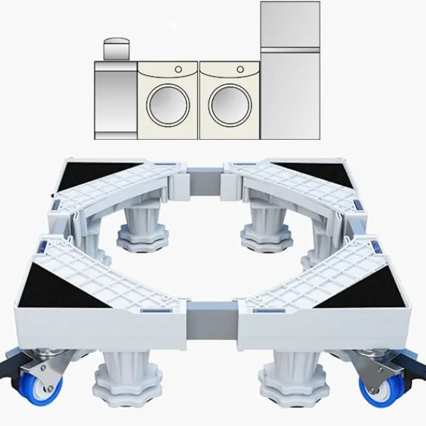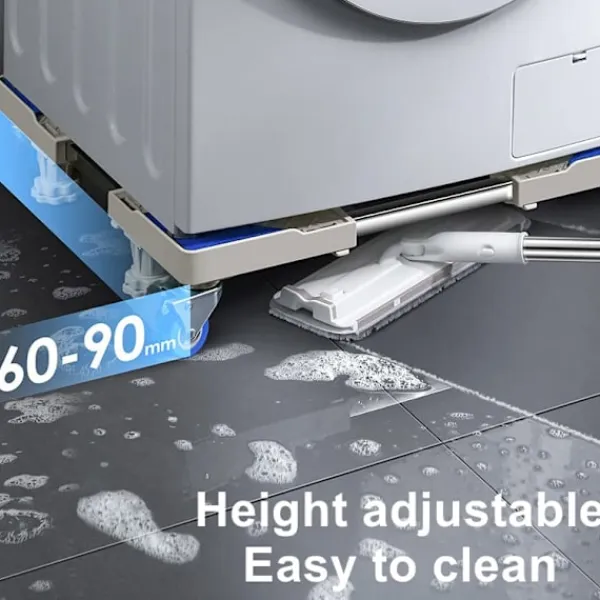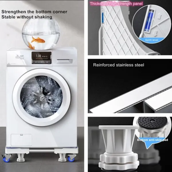 【Multifunktionell】: Universell bas. Jämfört med andra baser har vi 4 tjocka plattor (20 cm vardera) för att bygga en stor plattform. Vi har också 8 tjocka justerbara fötter och 4 dubbla hjul för att stödja basen. Lämplig för tvättmaskiner, kylskåp, torktumlare, skåp, möbler etc. [Kvalificerat material]: ABS-hartsmaterial, robusta PVC-delar och rostfri stålstång, hållbart. Med fyra vibrationsdämpande, ljud- och vibrationsskydd. Lastkapacitet: 200 kg. [JUSTERBAR]: Basplattformen kan justeras från standard 48 till 66 cm. Basens höjd kan justeras från 9 till 12 cm som standard eller extra stark från 10 till 14 cm. [Lätt att installera]: Levereras med en engelsk manual och gratis verktyg. Inga ytterligare kit krävs för att montera detta ställ. Levereras med ett 8-stegs vattenpass för enkel montering. [Rörlighet]: Bekväm att flytta och rengöra. Nyckellåsdesignen kan förhindra rörelse medan tvättmaskinen snurrar. Utrustad med 4 360-graders svängbara låshjul, du kan placera den på valfri plats. Undvik kollision och fukt. Hög mekanisk hållfasthet, slitstyrka, vibrationsdämpning, golvskydd.
