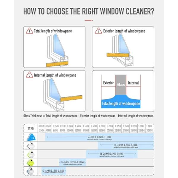 1. Lämplig för fönster med en tjocklek på 18-30 mm: Denna fönsterputsare är utformad för att effektivt rengöra enkel- och dubbelglas med en tjocklek på 18 till 30 mm. Den kan enkelt rengöra både insidan och utsidan av fönstret utan att behöva gå ut.
