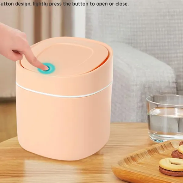 Bordssopbehållare med knapplock: Bordssopbehållaren med lock har ett infällbart lock som kan öppnas eller stängas genom att lätt trycka på knappen. Locket är förseglat och läcker inte lukt. Den är enkel att använda och hygienisk, är mycket praktisk.