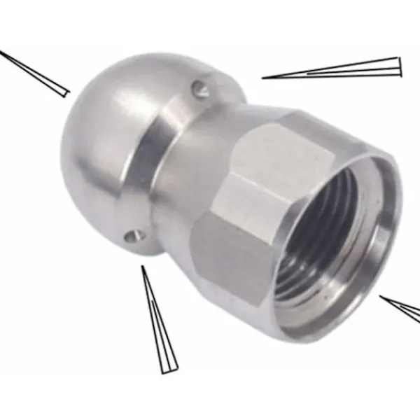 304 rostfritt stålmaterial 3/8 innergänga munstycke, spraya det första efter tre, används för att rengöra rör och vattenvägar. Rengör sprinklarna, allmänt kända som vattenmöss. Principen är att använda högtryckvattentryck, och rekylkraften från de tre vattenutloppsöppningarna på baksidan driver munstycket att gå framåt i röret och träffa rörväggen för att uppnå syftet med rengöring och rensning.