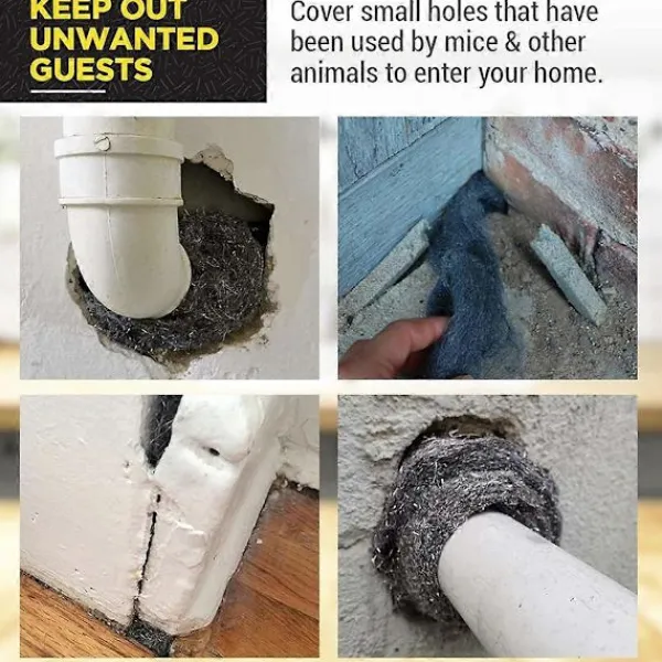 Bred Användning – Fin stålull skyddar effektivt mot möss eller små varelser som kommer in genom smala utrymmen, och den kan användas för att fylla inomhus och utomhus, till exempel hus, garage, kontor, kök, vind, radiatorrör, utrymmen runt rör, olika dräneringshål.