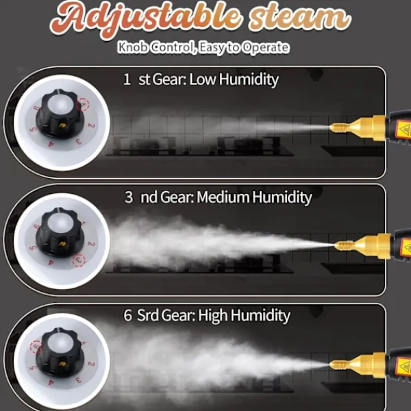 🎅🎅 【6-nivåers justerbar ratt】 Den handhållna ångrengöraren har en 6-nivåers justerbar ratt, du kan justera ångan för att kontrollera ångintensiteten för att möta dina olika dagliga rengöringsbehov. Samtidigt släpper denna handhållna ångrengörare ut cirka 3 bar
