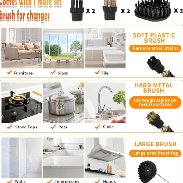 olika borsthuvuden kan högtrycksångaren inte bara användas för att rengöra köket, rengöra väggen, spisen, röken, mikrovågsugnen, tvättmaskinen, kylskåpet, bilen och mattan, utan kan också användas i stor utsträckning i kök, badrum, möbler, bil och