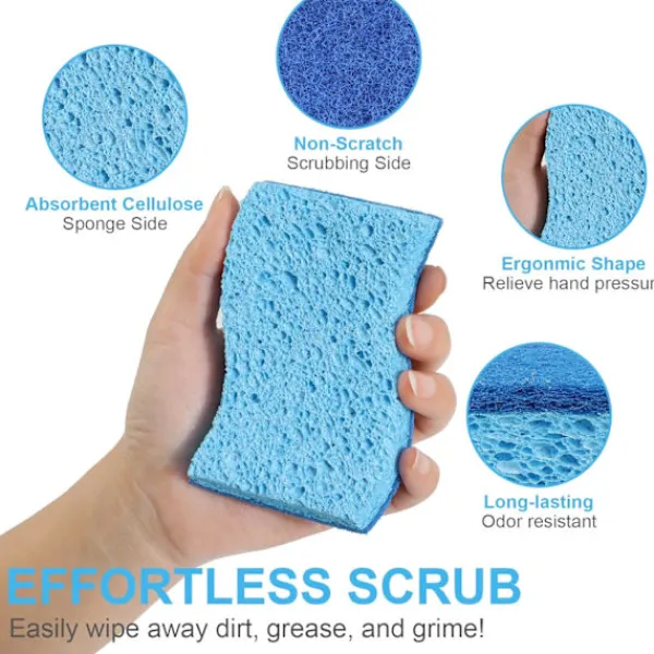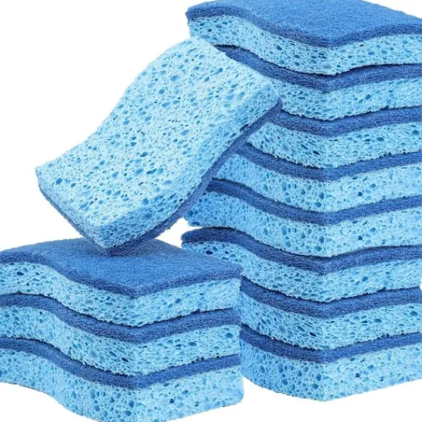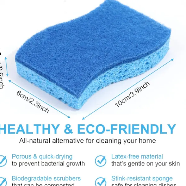 【Hälsosamt rengöringssätt】Vår kökssvamp är gjord av ett kungligt blått skrubbskikt och ett lager av ljusblå cellulosasvamp utan ränder. Till skillnad från sin plastmotsvarighet har vår disksvamp en porös struktur, vilket hjälper den att torka snabbt och minskar risken för att patogena föreningar förökar sig.