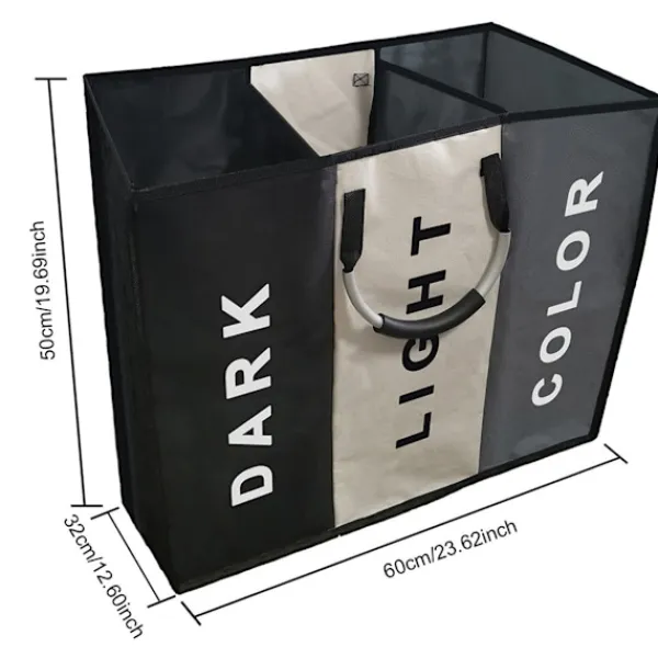 Förenkla tvättsorteringen med denna snygga och praktiska tvättkorg med 3 separata fack märkta ”Dark”, ”Light” och ”Color”. Tillverkad i slitstarkt oxford-tyg och stabil aluminiumram för maximal hållbarhet och lätt hantering. Perfekt för varje tvättrum eller badrum.