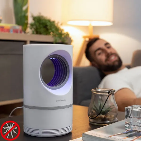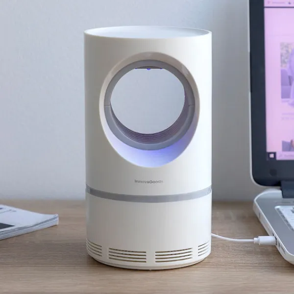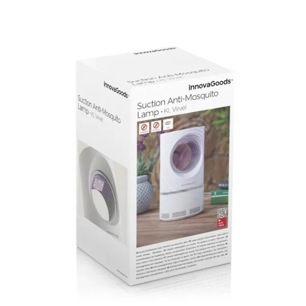 KL Virvel InnovaGoods myggavvisande lampa medsugkraft är mycketeffektiv för att omedelbart få bort myggor, flugor och andra flygande insekter.En dödlig fälla för insekter eftersom den har UV-lysdioder som lockar dem tillsig. Den har en stor sugkraft som fångar och samlar upp insekterna i enbehållare där de blir kvar och tillintetgörs utan möjlighet att komma undan.Denna UV-lampa mot myggor är dödligför myggor men ofarlig för människor och husdjur.