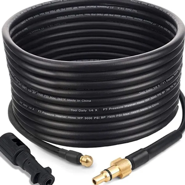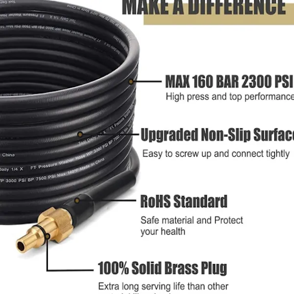 15 m slang, tillverkad av slitstarkt vävt tyg. Den bakre högtrycksstrålen driver slangen genom avloppet för enkel rensning.