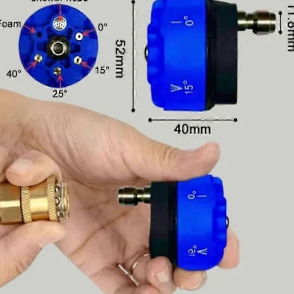 Produktparametrar:Namn: Multifunktionellt munstycke för högtryckstvätt i rostfritt stålFärg: blåMaterial: rostfritt stålStorlek: 52mmX40mmX11.8mmVattenutlopp: 1.2 hål, 1.4 hål