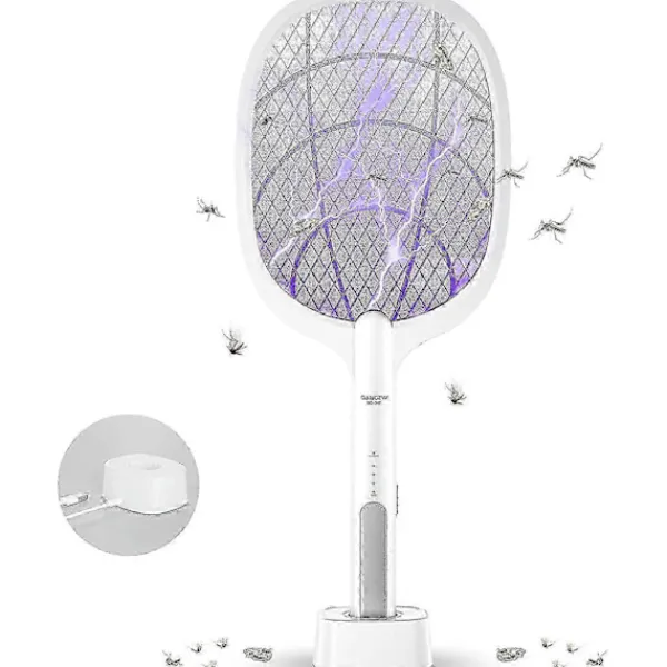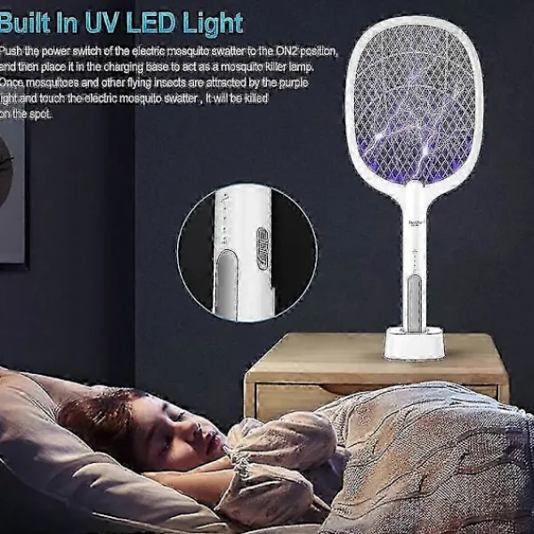 Smart Mygg Inbyggt UV LED-ljus, slå på den elektriska myggsmällans strömbrytare till ON2-läget och placera den sedan i laddstationen för att fungera som en elektrisk insektsdödare. Så snart myggor och andra flygande insekter lockas av det violetta ljuset dödas den elektriska flugsmällan omedelbart.